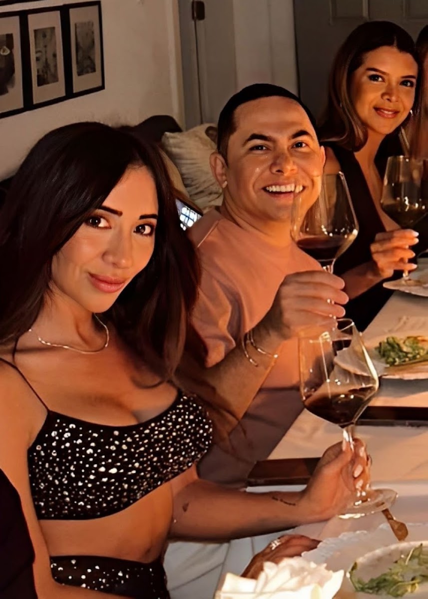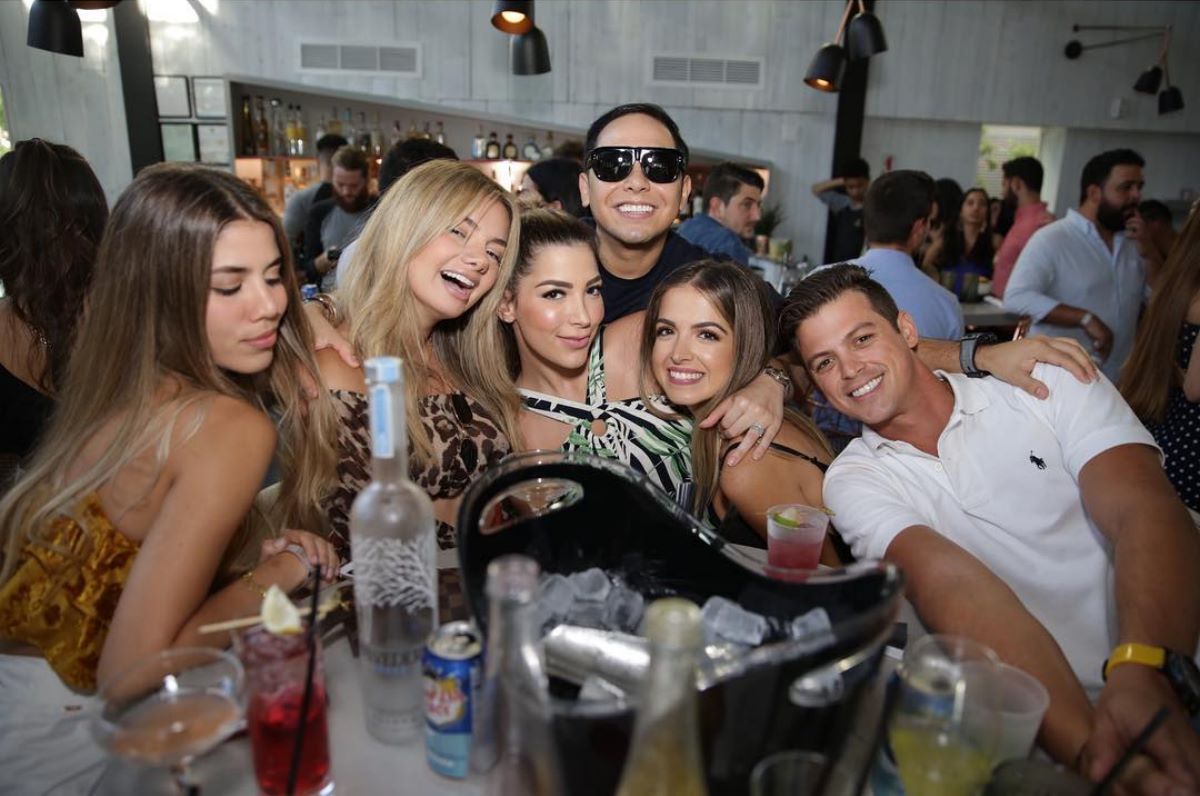 Hendrick Bages (derecha) y un grupo de amigas siendo abrazados por Ismael Bracho (de lentes oscuros)